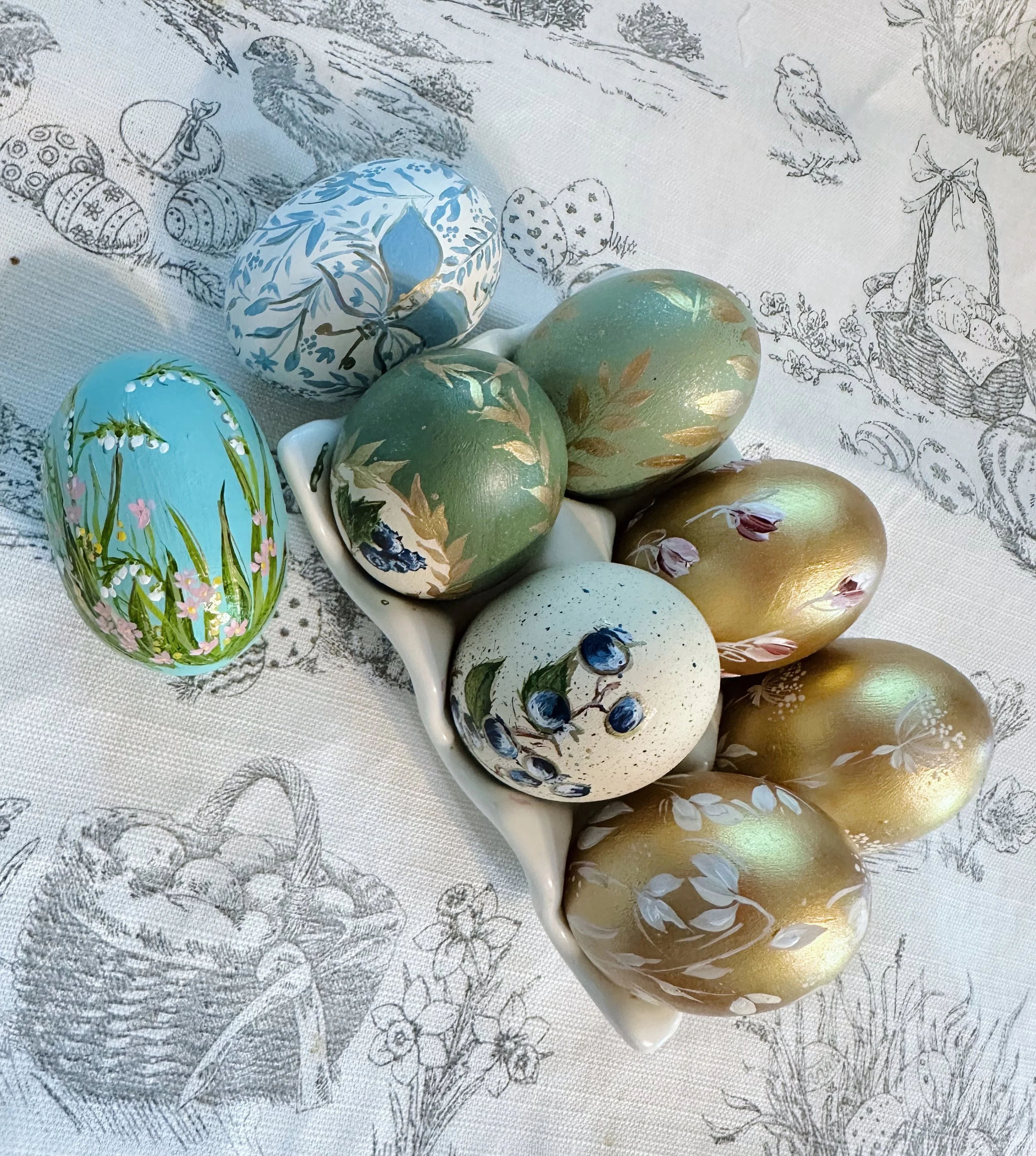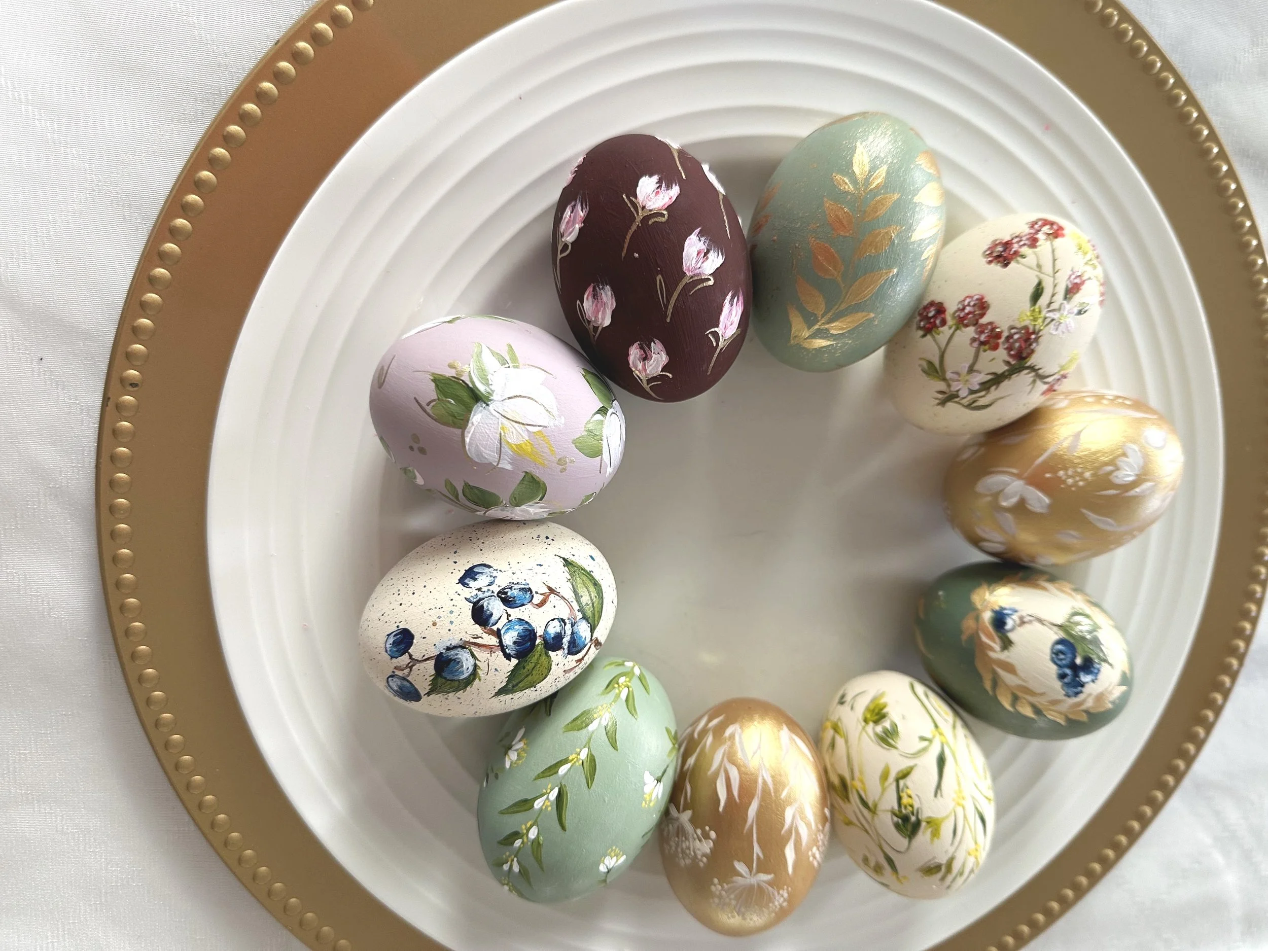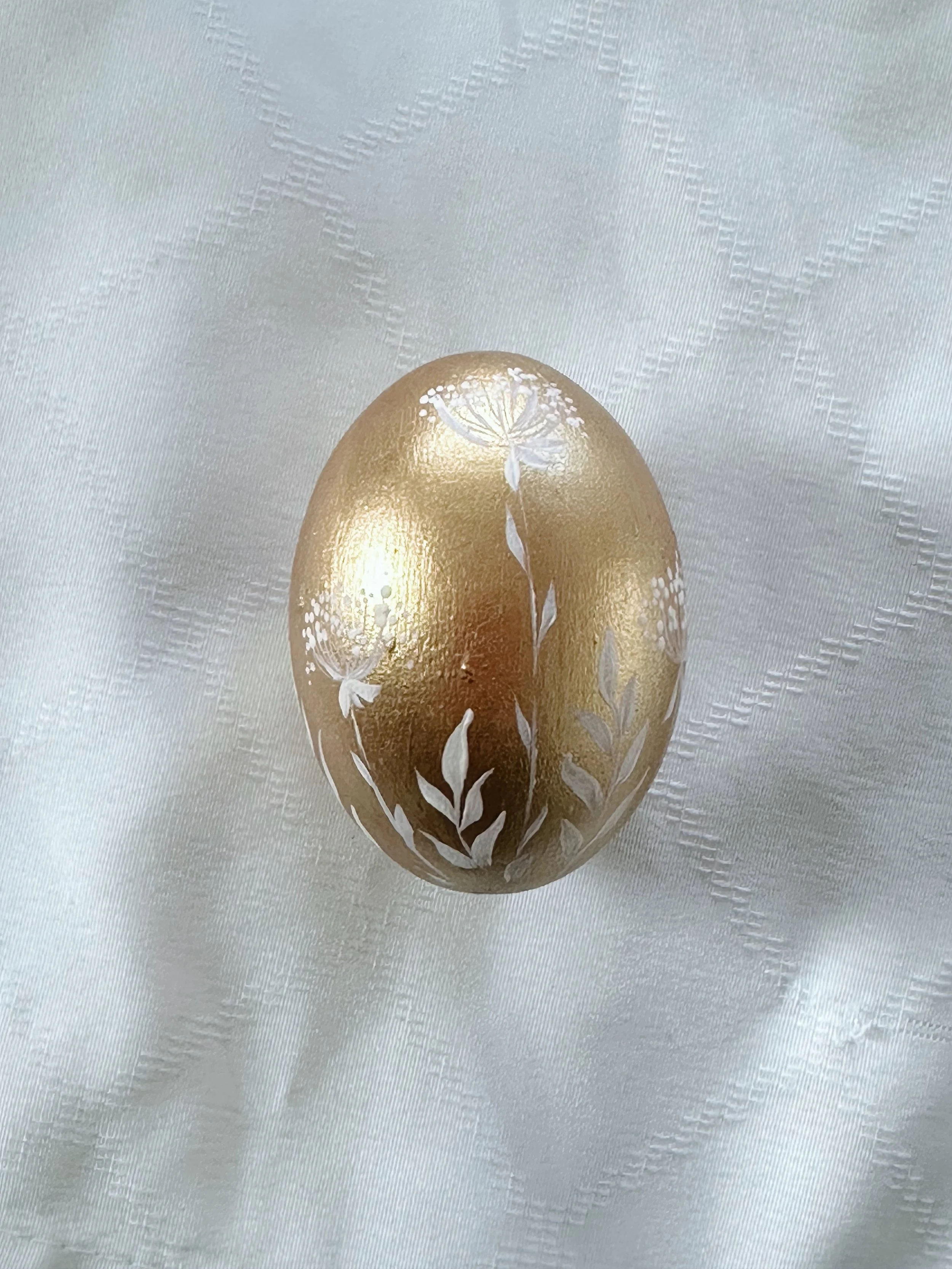 Each egg is a unique work of art, meticulously hand-painted with bright, colorful floral patterns using high-quality acrylic paints. Accented with delicate gold touches, these eggs blend traditional craftsmanship with a modern, elegant touch—perfect for gifting, collecting, or adding a sophisticated charm to your Easter celebrations.