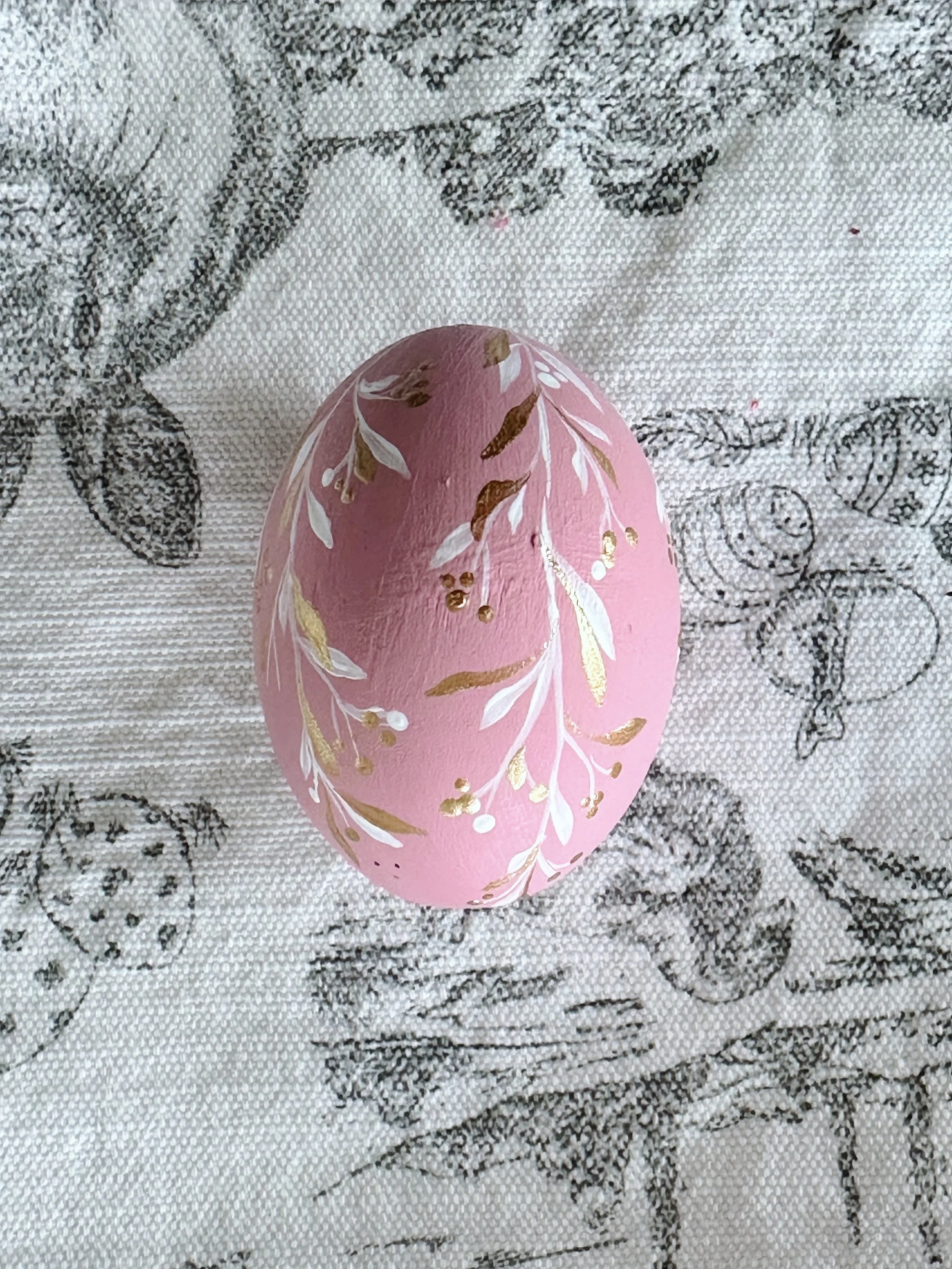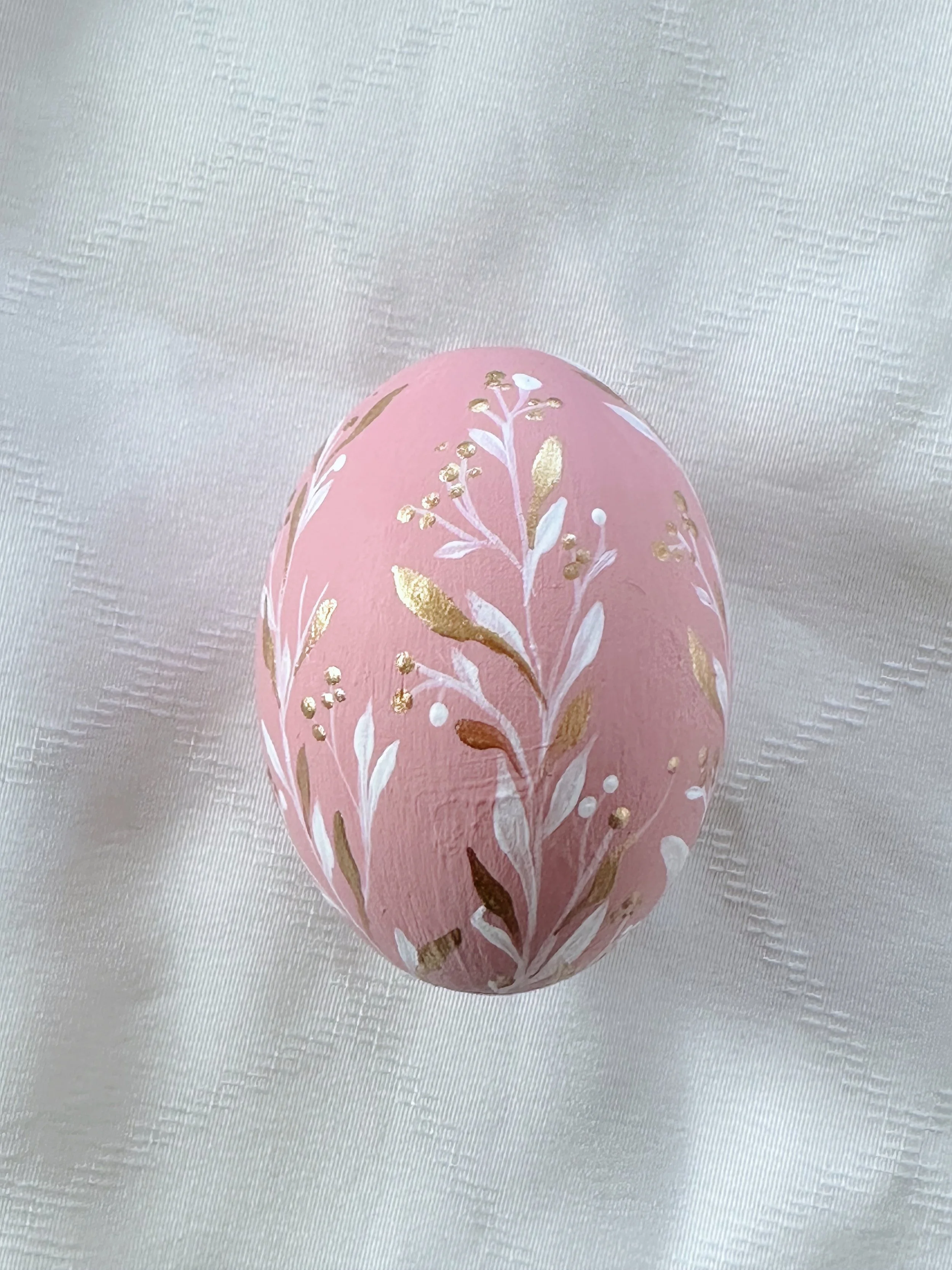 Easter Egg no.15 is hand painted in feminine pink with beautiful white and gold flora. Each piece is a floral work of art by Eilish Cott to bring the color and beauty into your Easter home. Display in your easter tablescape or gift to a friend or loved one. This solid wooden egg will last a lifetime..