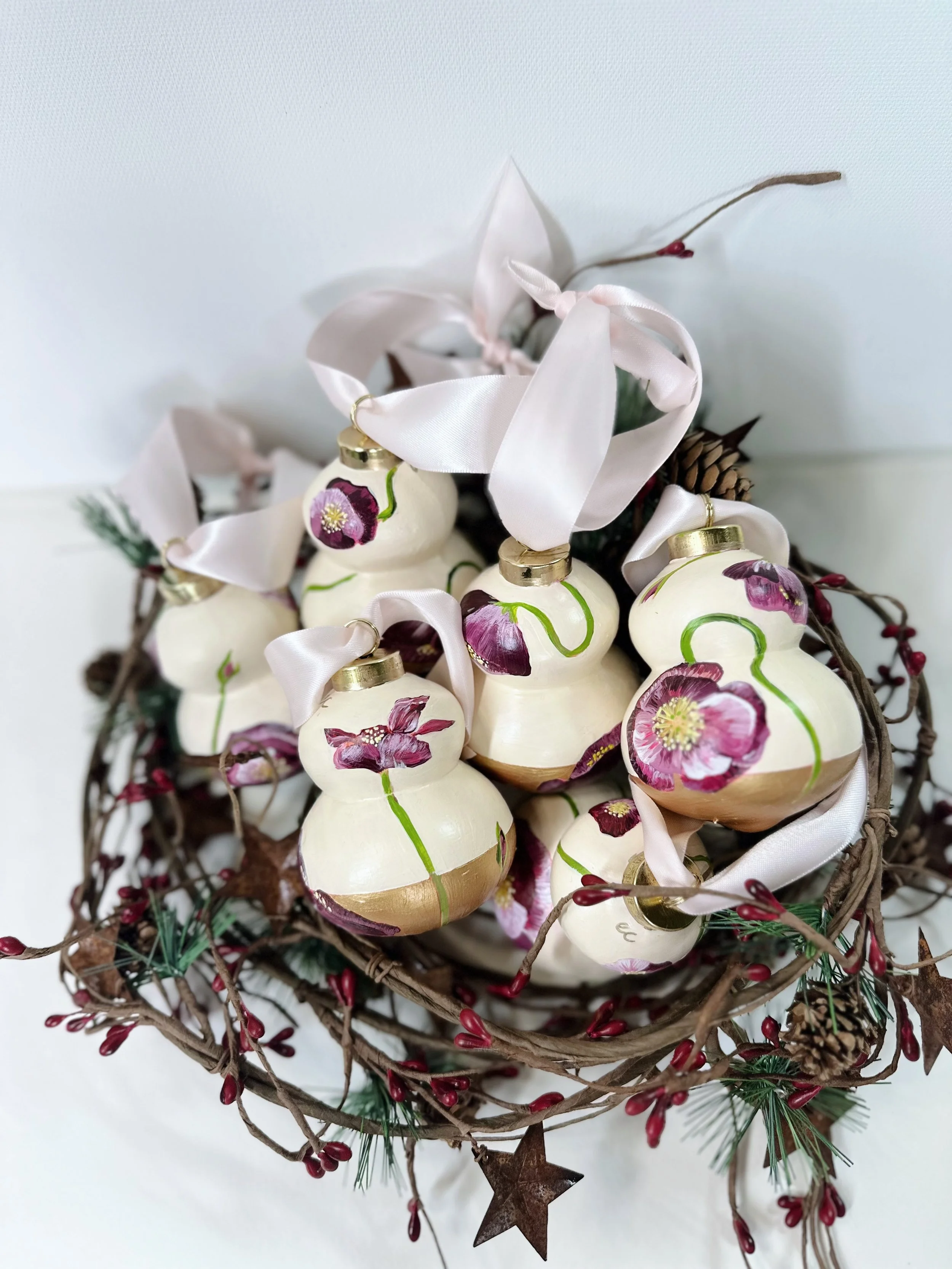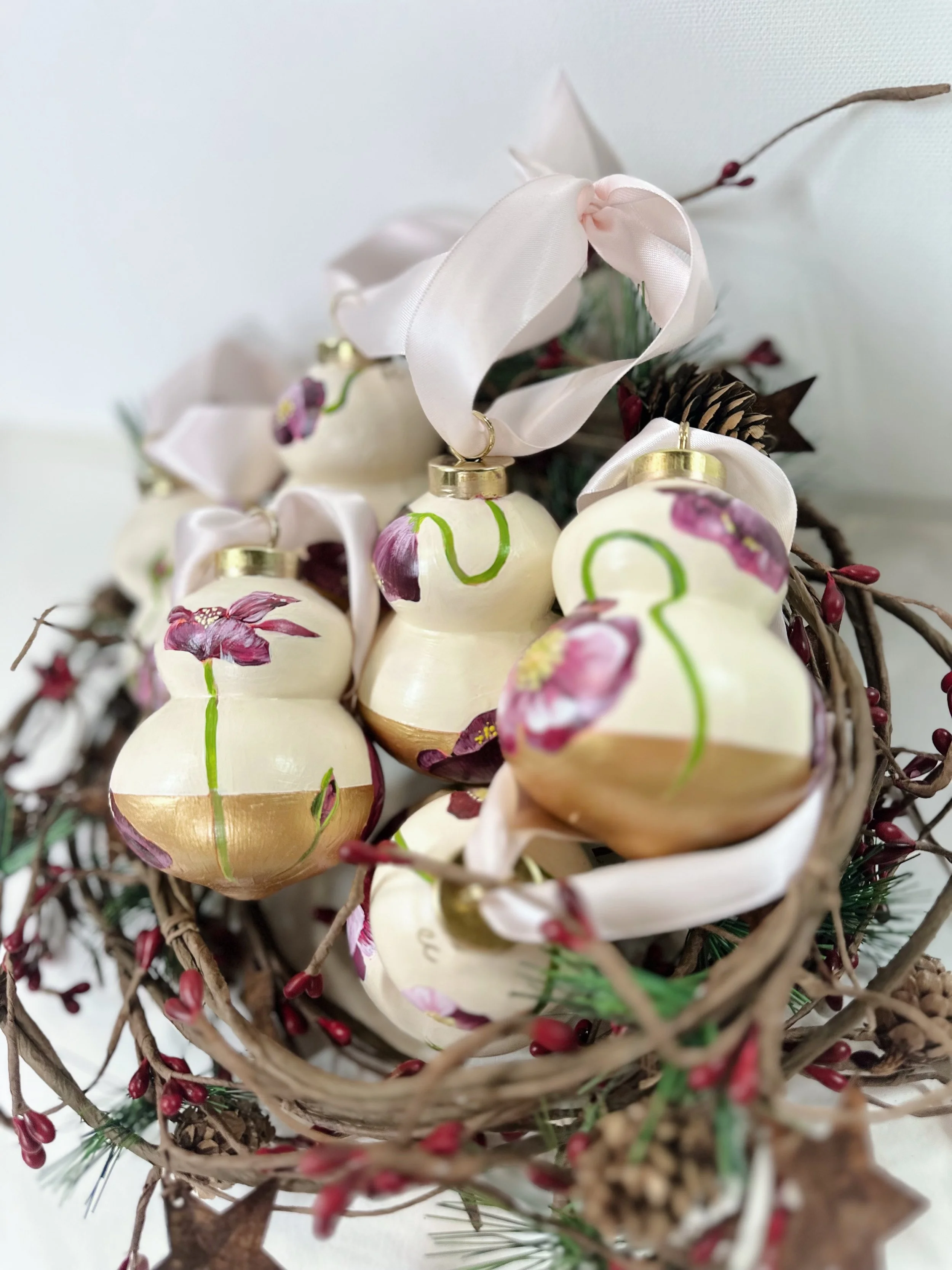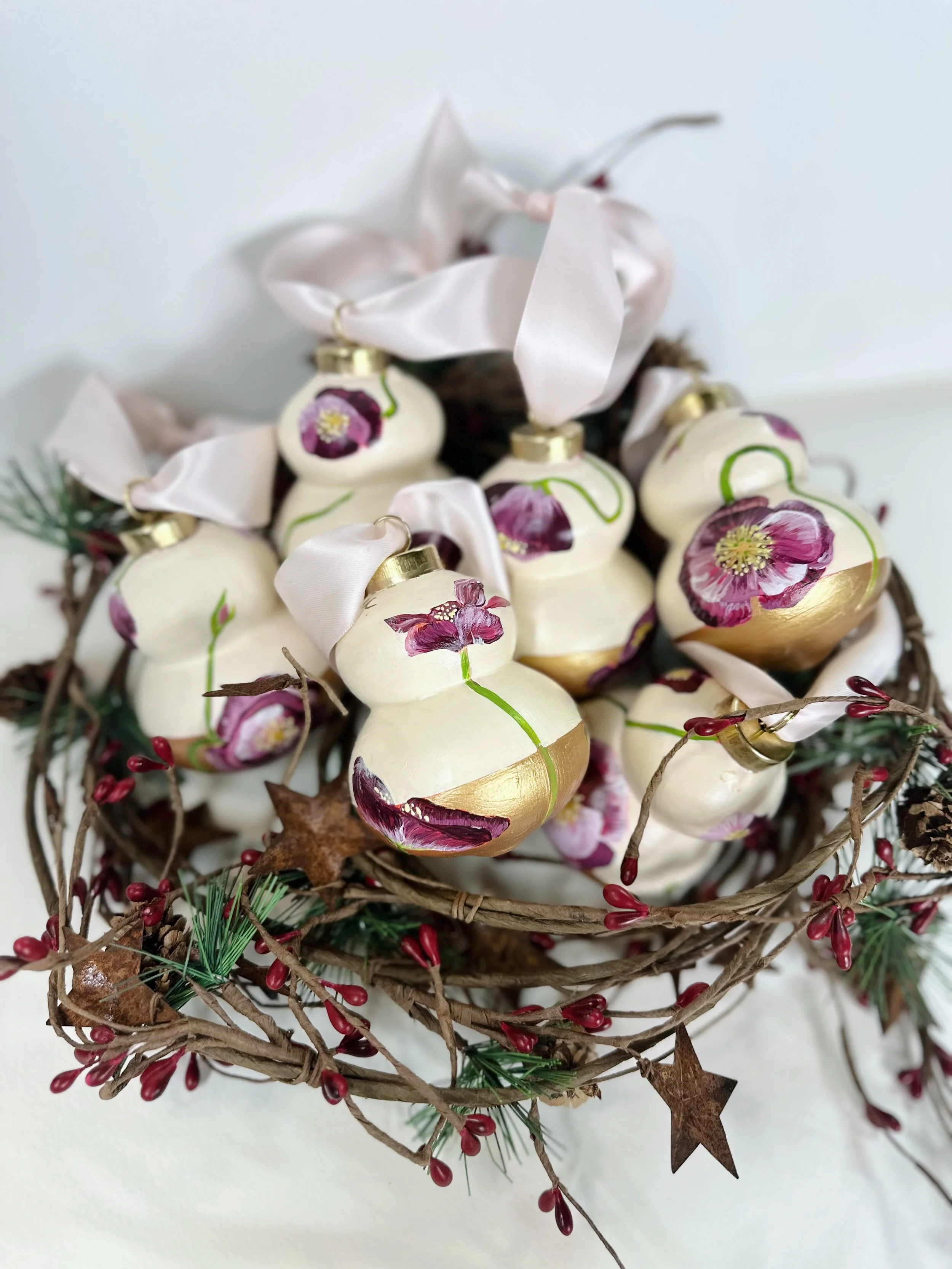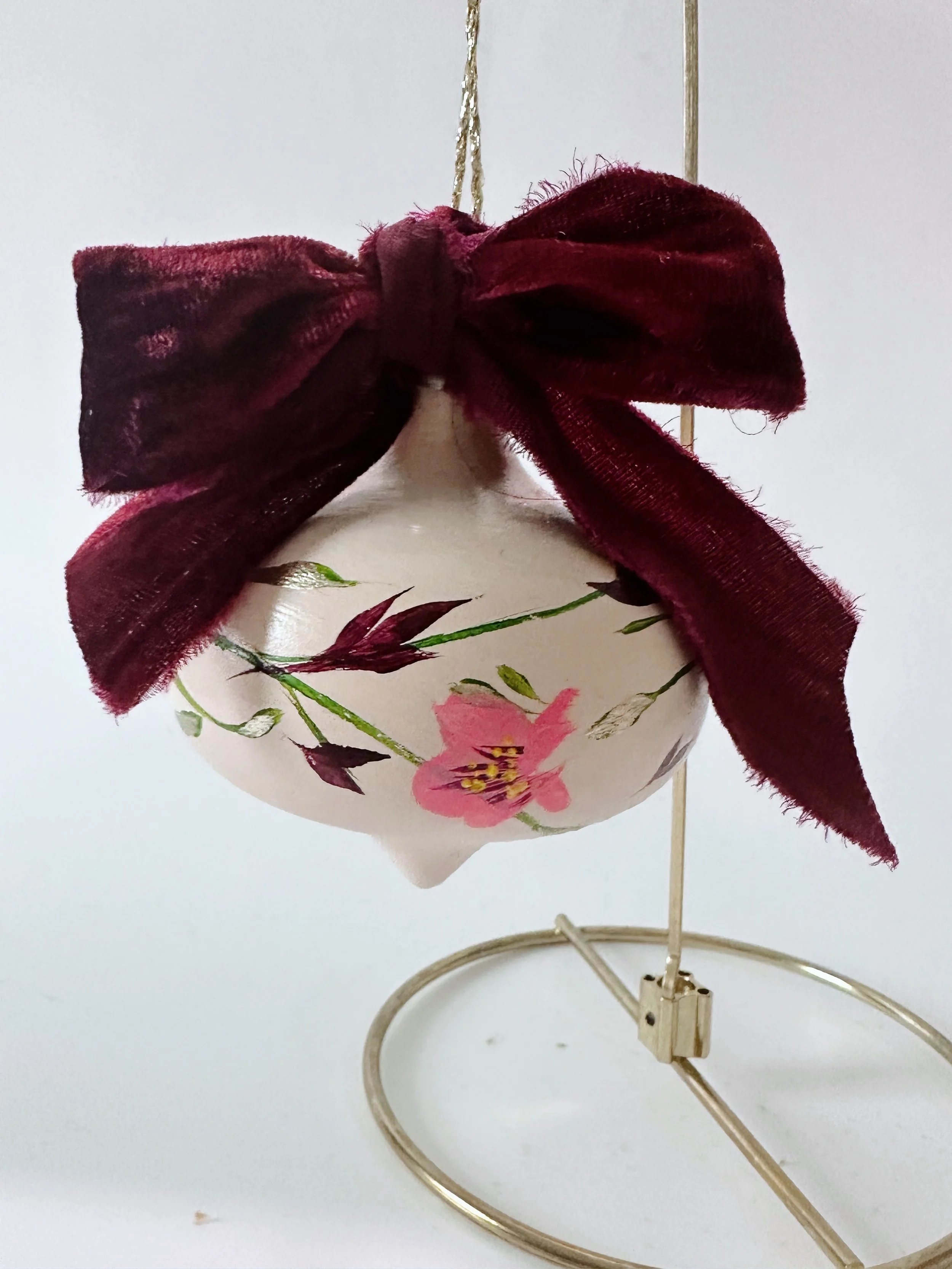 These handpainted, beautifully detailed tree ornaments celebrate our love of flowers, regardless of the season! For the holidays, bring in a little colour and beauty to your tree with these ornaments, all coming tied with a beautiful velvet bow, ready to hang!