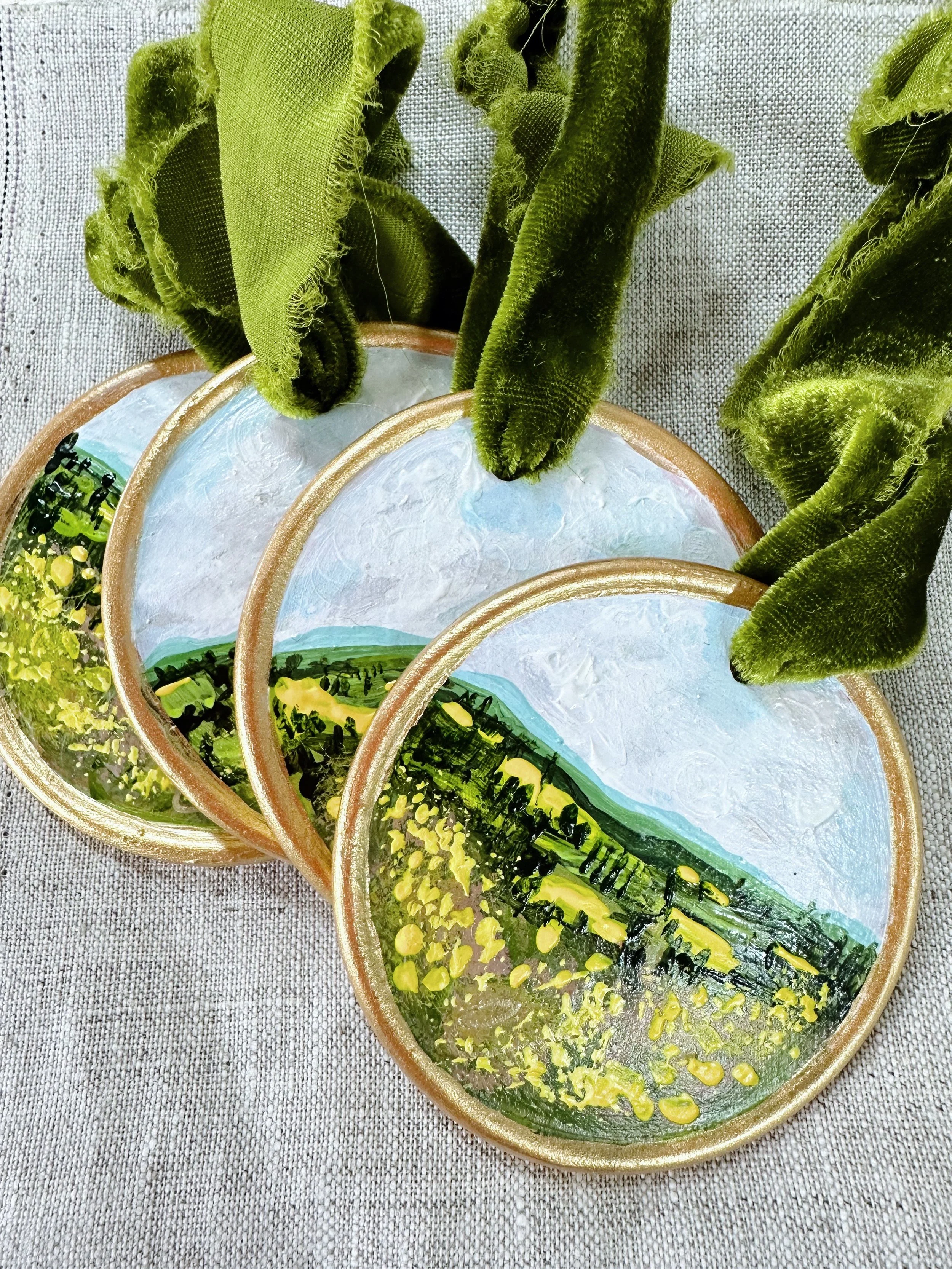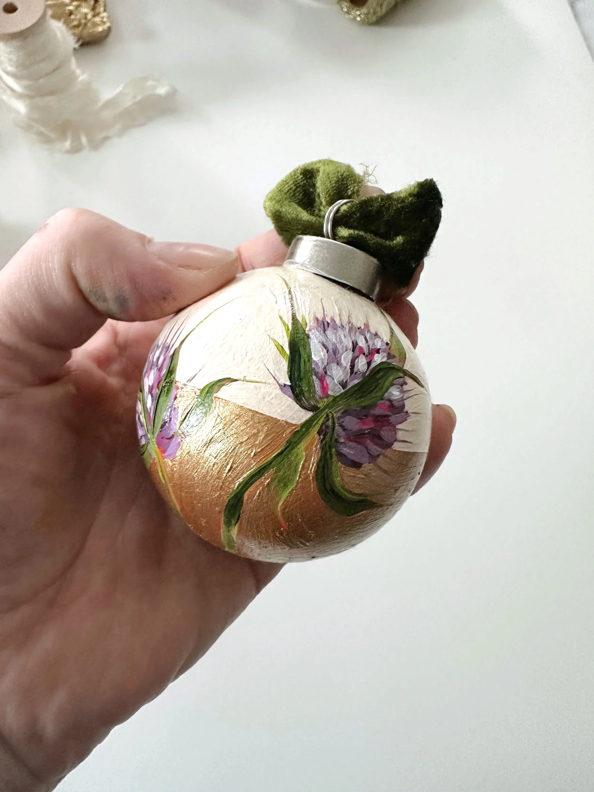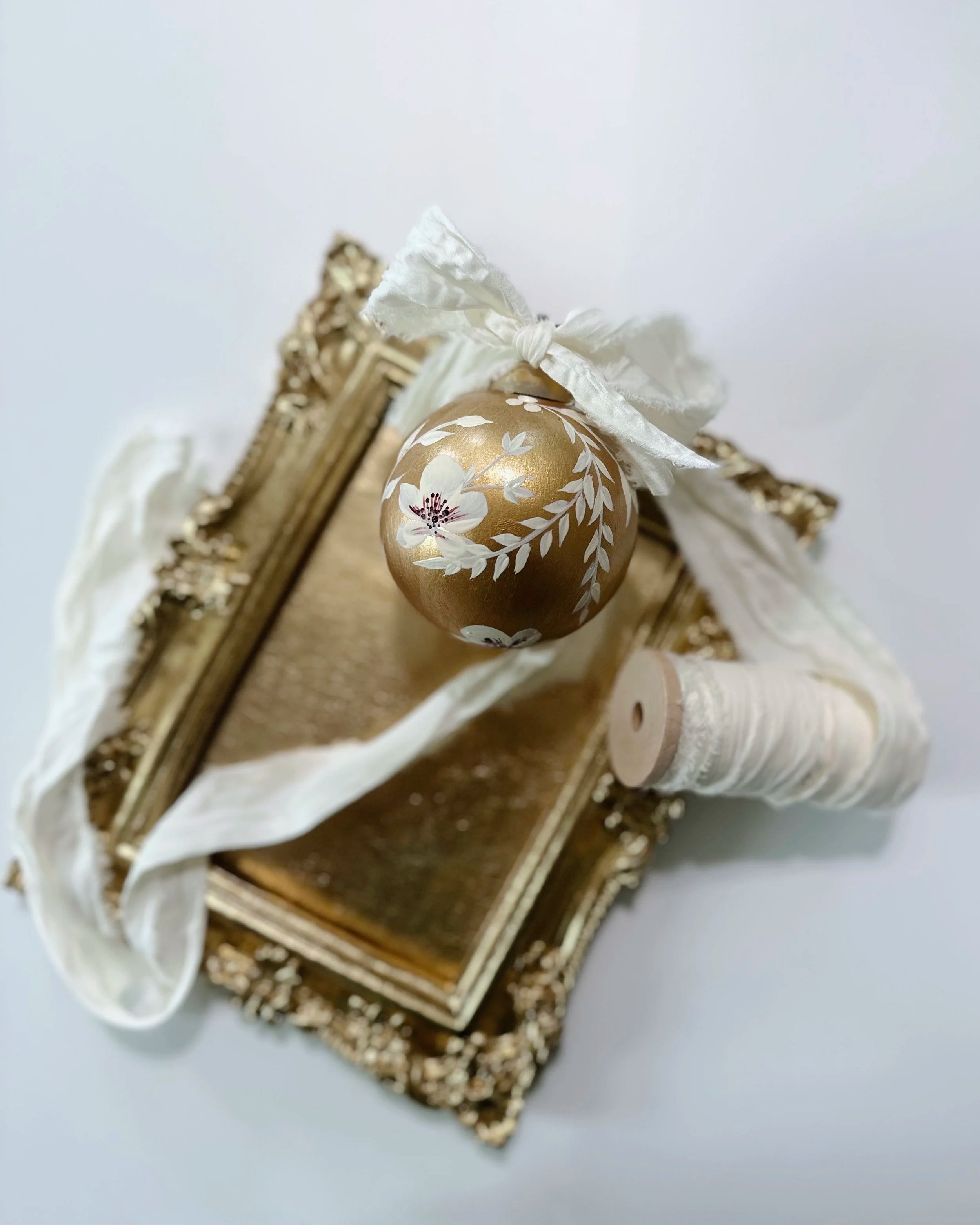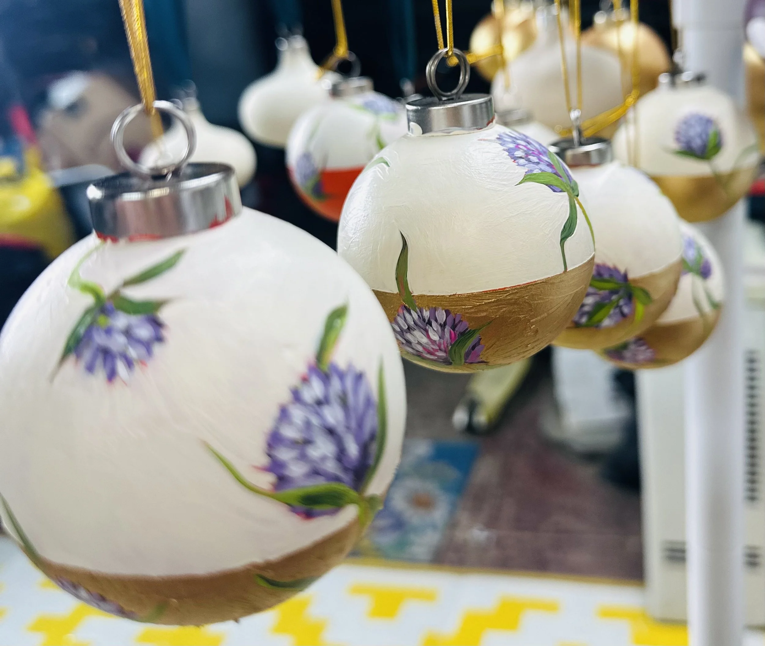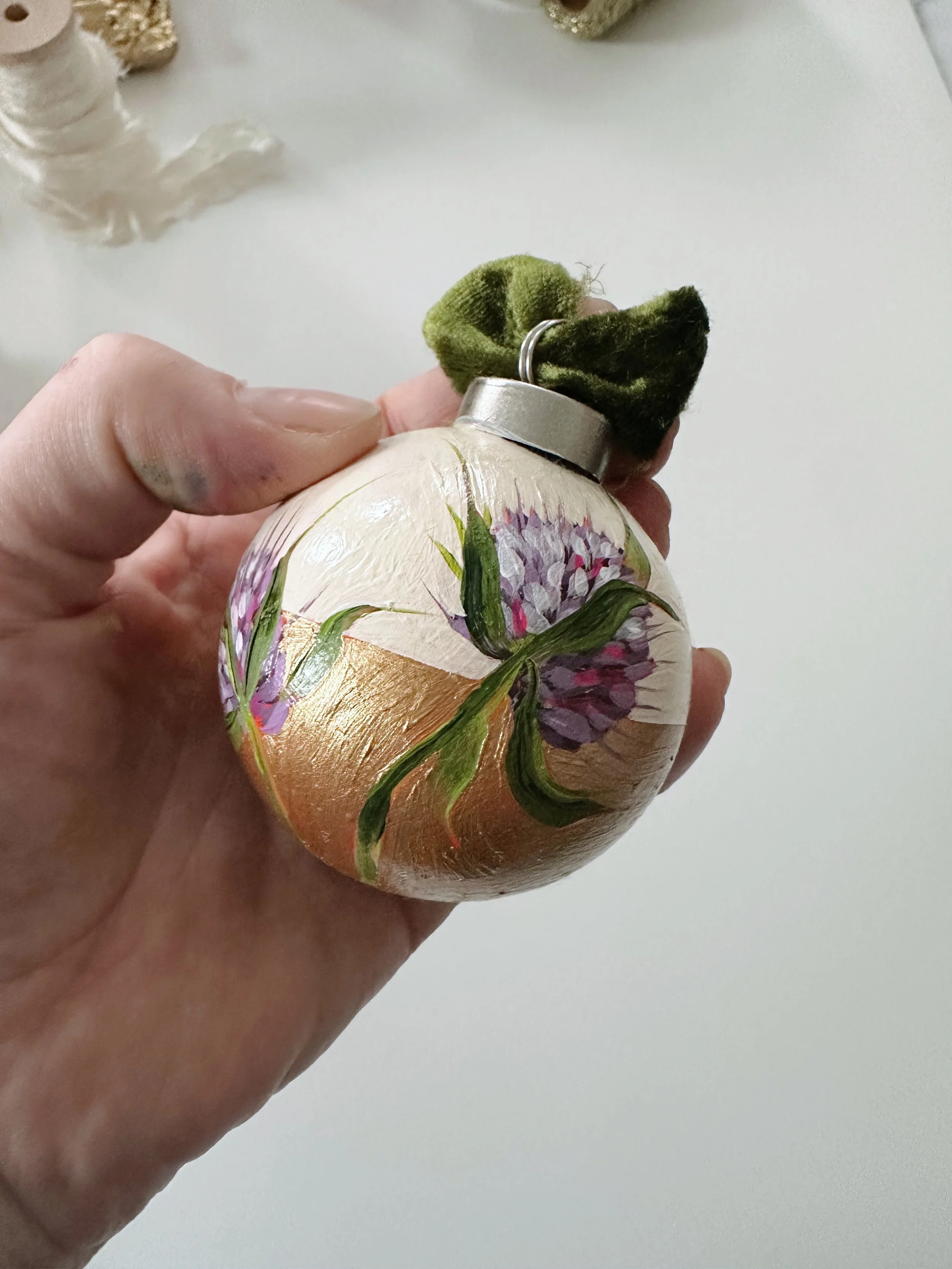 These handpainted, beautifully detailed tree ornaments celebrate our love of flowers, regardless of the season! For the holidays, bring in a little colour and beauty to your tree with these ornaments, all coming tied with a beautiful velvet bow, ready to hang!